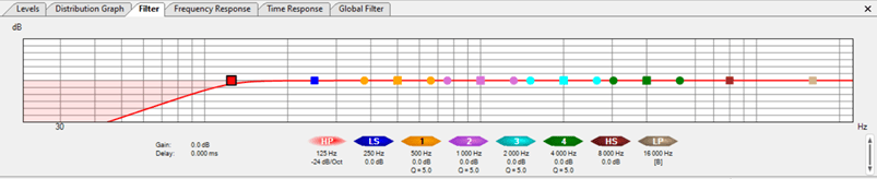 Altri parametri di non meno rilevanza ma che aiutano il processo decisionale di progettazione e velocizzano cosi quello di verifica e calibrazione sul campo, sono la possibilità di visualizzare il tempo di ritardo tra le varie sorgenti cosi da linearizzare temporalmente il sistema mettendolo il più possibile in fase e la possibilità di applicare filtri per verificare sia la corretta linearità del crossover elettrico a livello di crossover acustico che l’effetto di una pre-simulazione di equalizzazione come allineamento spettrale (fig. 12).