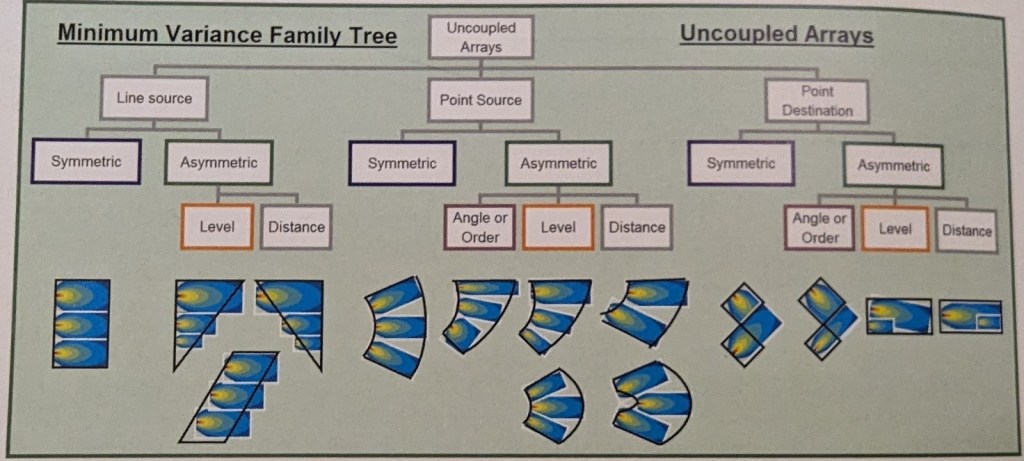 Senza entrare nel dettaglio, che vedremo meglio più avanti, nella figura 6 è indicativamente illustrato come ottenere minima varianza in base al tipo di installazione (sorgenti accoppiate e disaccoppiate, simmetriche e asimmetriche), questa immagine evidenzia come per un certo tipo di installazione è più utile lavorare sull’angolo di copertura tra più sorgenti piuttosto che sul livello.