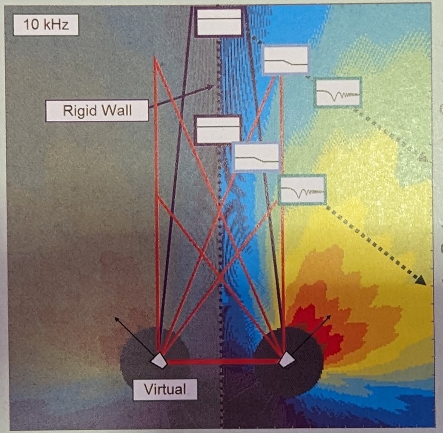 – Un programma di simulazione acustica per essere più realistico possibile nella sua previsione, dovrebbe prevedere anche le somme e cancellazioni dovute alle riflessioni ambientali, un po’ come fa EASE. Nel caso non sia presente, è possibile simulare un ambiente molto riflettente inserendo delle sorgenti speculari al di là delle pareti considerate riflettenti 100% (fig. 8).