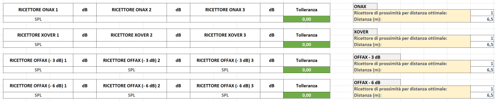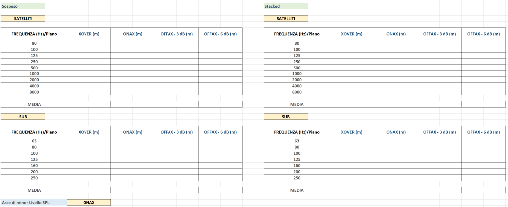 Analizzare il livello SPL per i vari piani ricettori (XOVER, ONAX, OFFAX – 3 dB, OFFAX – 6 dB), a ritrovare il punto (distanza metri) a – 6 dB, diviso tra tutto il sistema Sub e tutto il sistema Satelliti.