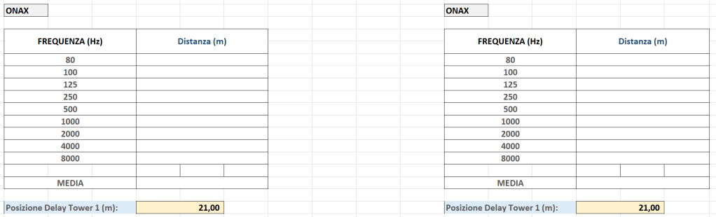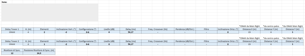 Collocare il secondo Delay Tower sulla linea ONAX del secondo sistema “se presente” cosi da bilanciare il livello nello spazio ed avere cosi un prolungamento della gittata sonora sia per il Left che per il Right. Partire con variare la distanza tra i due sistemi (quindi più vicino e più lontano rispetto alla distanza di inserimento), poi l’angolo di inclinazione tra il Delay Tower 1 e 2 e valutare gli effetti sulla Varianza Minima.