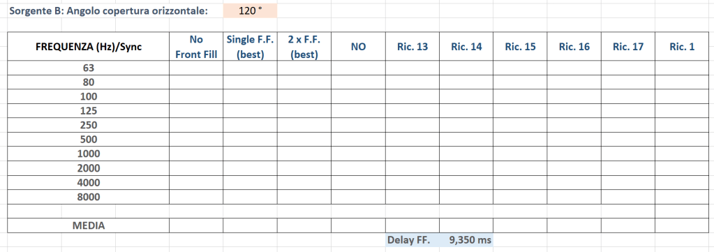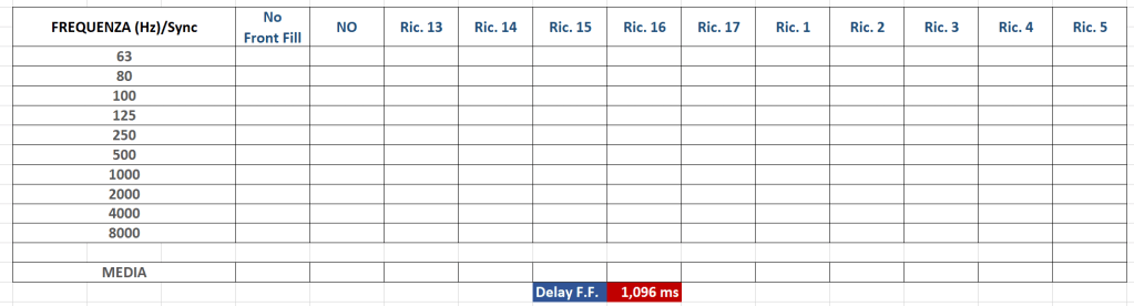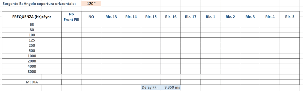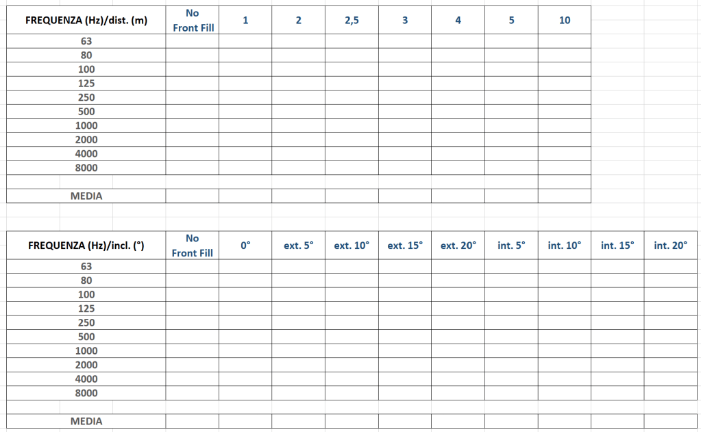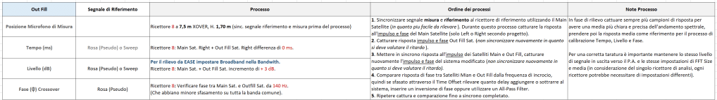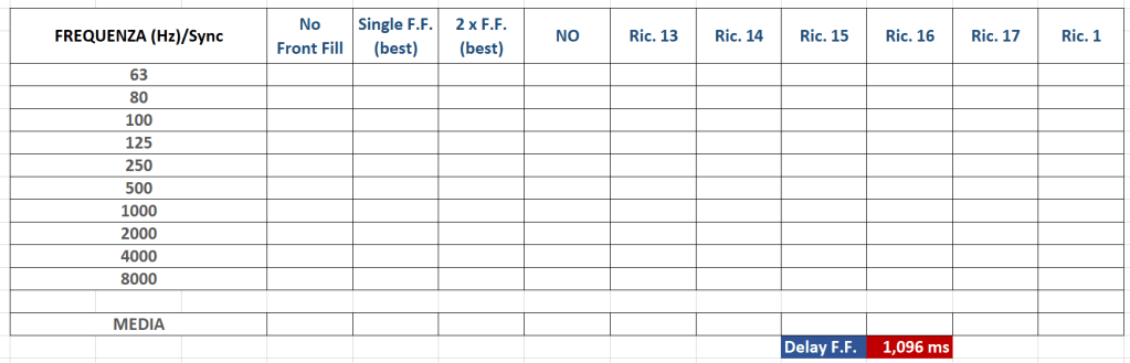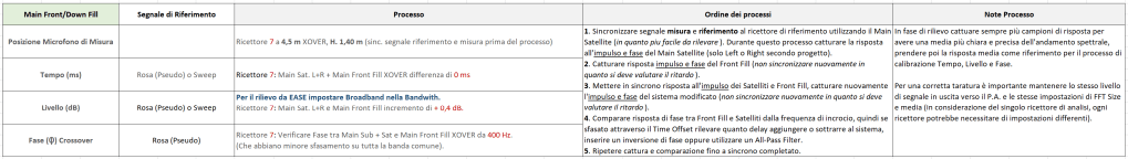 Comparare singolo Front Fill con il doppio Front Fill, nel doppio Front Fill trovare distanza e angolo di inclinazione ottimale. Per varianza entro i +/- 1 dB valutare sempre di utilizzare sincronismi con meno ritardi possibili.