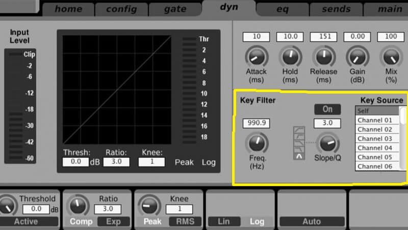 In aiuto al processo di compressione può esserci l’attivazione dei filtri che spesso accompagnano questi processori come parametri di controllo attivabili (fig. 12) cosi da limitare il processamento solo alla banda di frequenze interessata e lasciare cosi libero il restante per il solo processamento tonale, ma anche in questo caso i filtri soprattutto se analogici non sono di grande qualità e portano maggiori sfasamenti e distorsioni sul segnale audio.