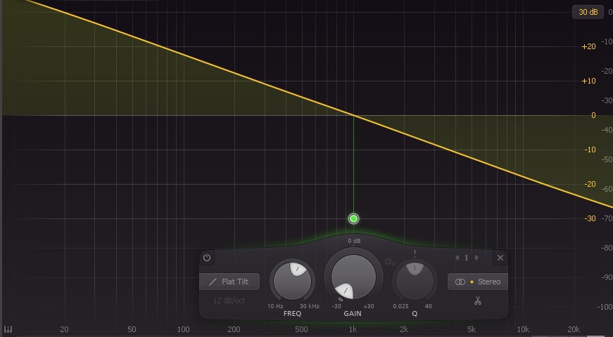 Esiste anche una variante lineare che si chiama Flat Tilt (fig. 6), in cui la curva di amplificazione/decadimento tra prima e dopo una frequenza di Taglio è data dall’utilizzo di apposite circuiterie di filtri Cut Out Hi Cut e Low Cut, ma in cui in questo caso è possibile regolarne l’ampiezza di banda a decadimento lineare ed in cui è spesso anche possibile decidere la pendenza di taglio.