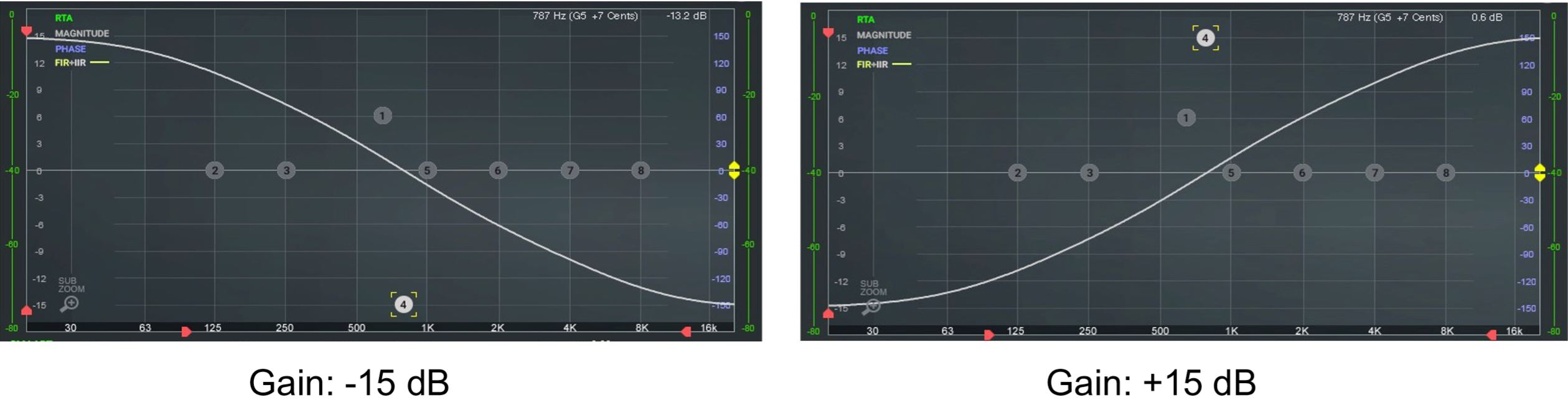 La curva Tilt consente di estremizzare la tonalità della risposta in frequenza con un solo controllo potenziometrico, spesso minimizzando eccessivi rumori e distorsioni derivati dall’utilizzo di più potenziometri (anche se in ogni caso al suo interno, due sono gli apparati che lavorano sull’amplificazione ed attenuazione, un Low Shelving ed un High Shelving che condividono la frequenza di Giro). Potendo associare un doppio controllo ad un solo filtro in cui è ottimizzata anche la risposta di fase e distorsioni derivate dall’utilizzo di più filtri. Come si vede dalla figura 3 può lavorare sia con Boost prima della frequenza di Giro e Cut dopo la frequenza di Giro che al contrario.